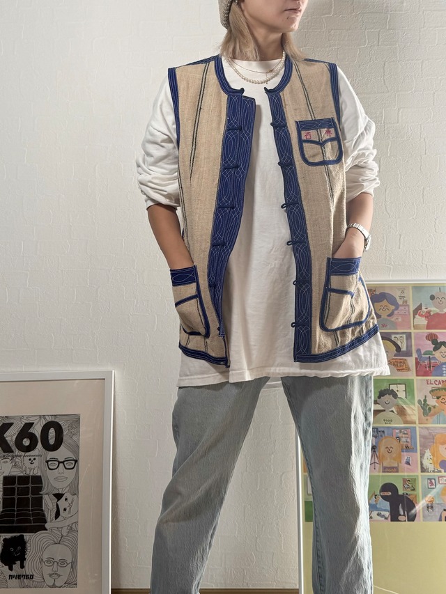 チャイナデザインの麻ベスト。 麻✖️ブルーの配色が可愛いです。 コーディネートに遊びを入れたい時におすすめ。 '石林'さんのものだったのも 癖ありで可愛いです。 着用者 160cm -MATERIAL- NOT LISTED -SIZE- 着丈 69cm バスト 99cm 肩幅 38cm ※ サイズは平置き採⼨になりますので若⼲のずれが⽣じる場合がございます。予めご了承下さい。 --------------------------------------- 当店ではUSED・VINTAGEを取り扱っております。 古着の経年変化における⾵合いについて、事前にご理解いただきご購入頂けますと幸いです。 また商品についてご不明な点がございましたら、ご購⼊前にcontactよりお気軽にお問合せ下さいませ。 - 注意事項 - ⚫︎掲載の商品画像に関しまして、より実物に近い⾊味で撮影を⾏っておりますがご使⽤頂いているブラウザやパソコン等の環境により、実際の⾊味と異なる場合がございます。あらかじめご了承ください。 ⚫︎また、商品の経年変化によるダメージ部分や汚れに関しては画像を掲載しておりますが、⽬⽴たないものにおいて掲載しきれていない部分もございます。こちらもあらかじめご了承ください。 ⚫︎ご購⼊後の掲載内容( サイズ・画像のカラー・商品説明) と実物との若⼲の違い等による返品に関しましては、お受け致しかねます。恐れ⼊りますが、あらかじめご理解の上ご購⼊くださいませ。 ⚫︎当店の過失による返品希望と判断させて頂いた場合にのみ返品対応させて頂きます。 その際は、商品到着⽇から3⽇以内にご連絡ください。内容確認のうえ返品⽅法についてご案内させて頂きます。 尚、商品到着から4⽇以降のお問い合わせにつきましては、当店過失においても返品をお受け出来兼ねます。 あらかじめご了承ください。 ⚫︎ご注⽂後5⽇以内の配送を予定しております。 ※土日祝を含む場合は休み明けの平日より5日間とさせて頂きます。 ⚫︎商品到着の⽇時指定をされる場合ご注⽂の際の備考欄にご記⼊ください。 尚、指定⽇はご注⽂後5〜10⽇の間で承ります。 ●銀行振り込みでのお買い物はトラブル防止のためお断りさせていただいており、カード決済のご協力をお願い致します。