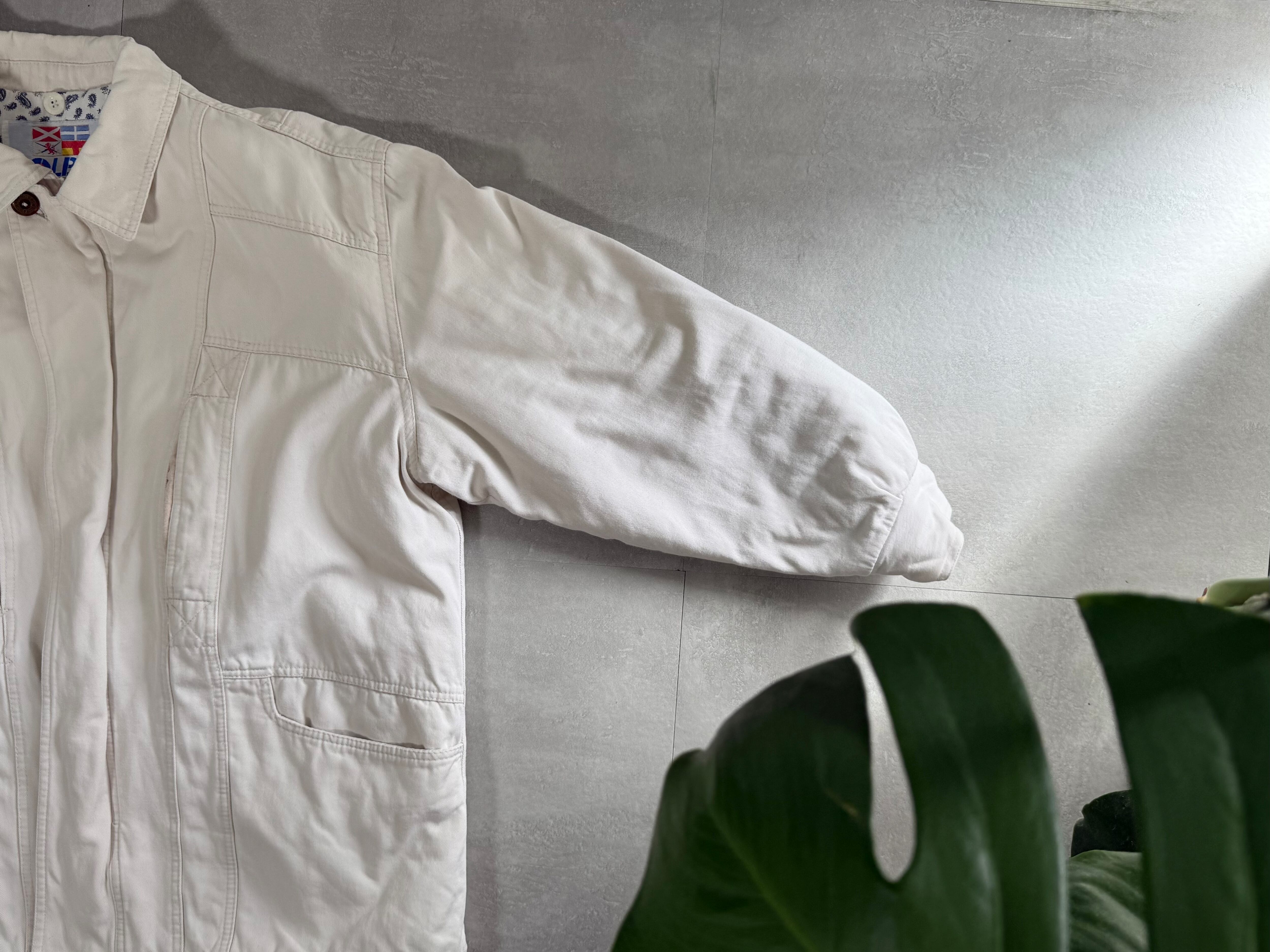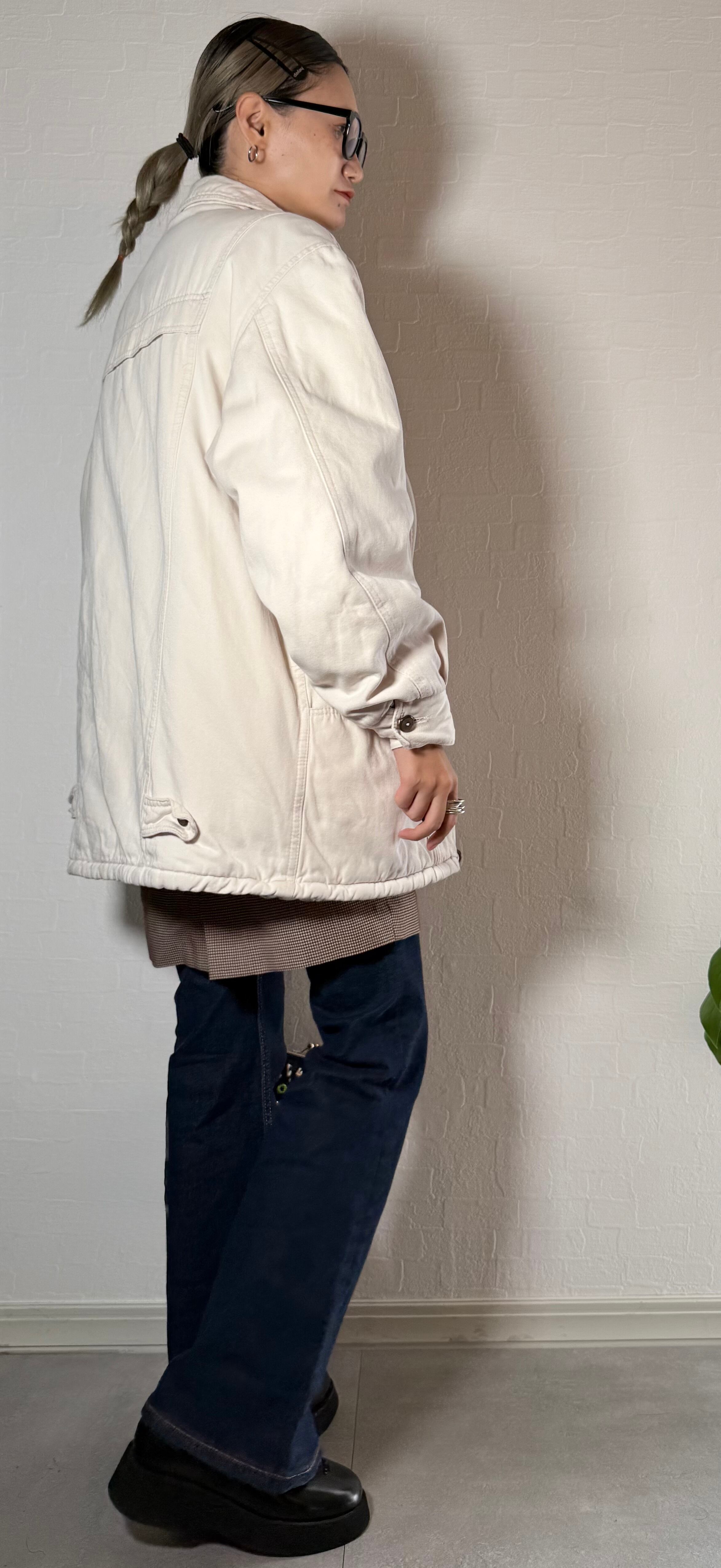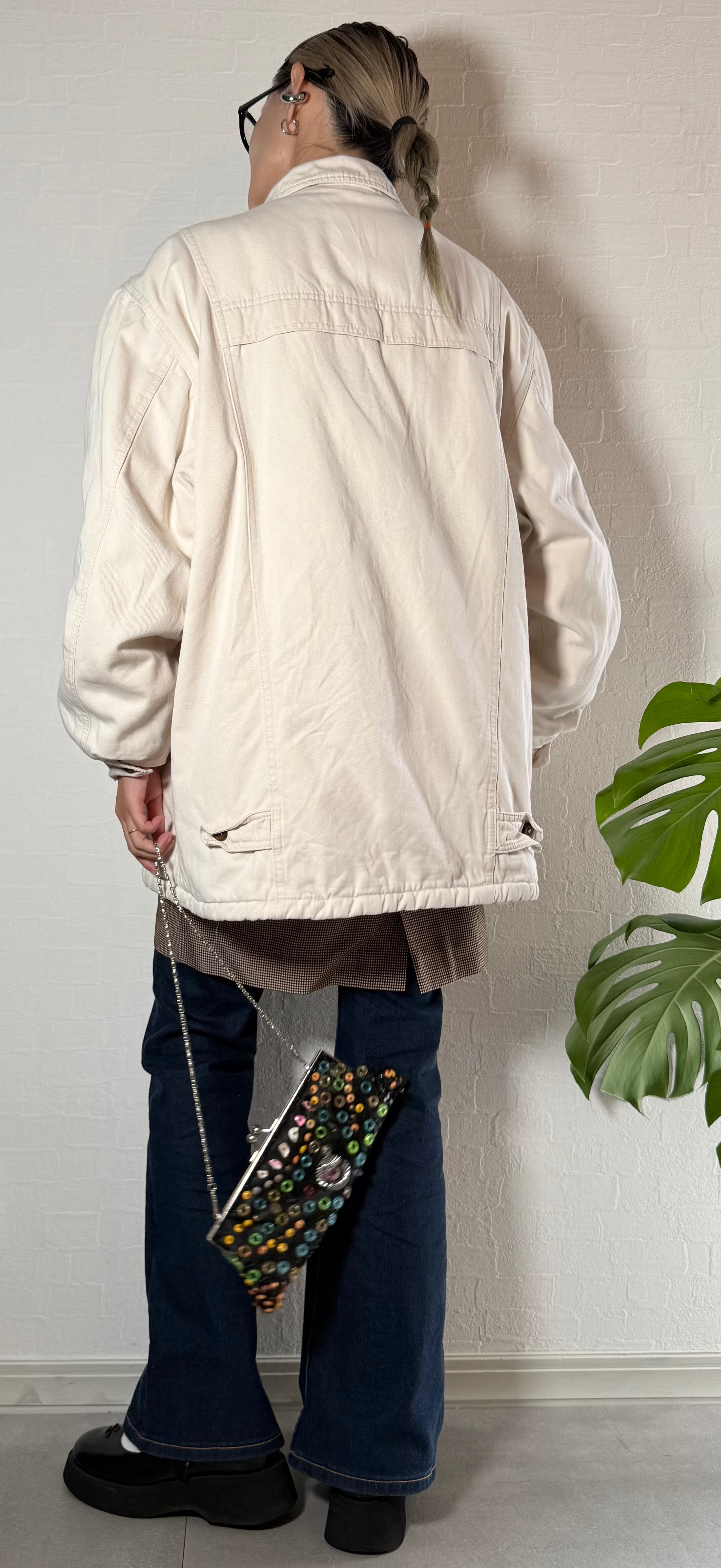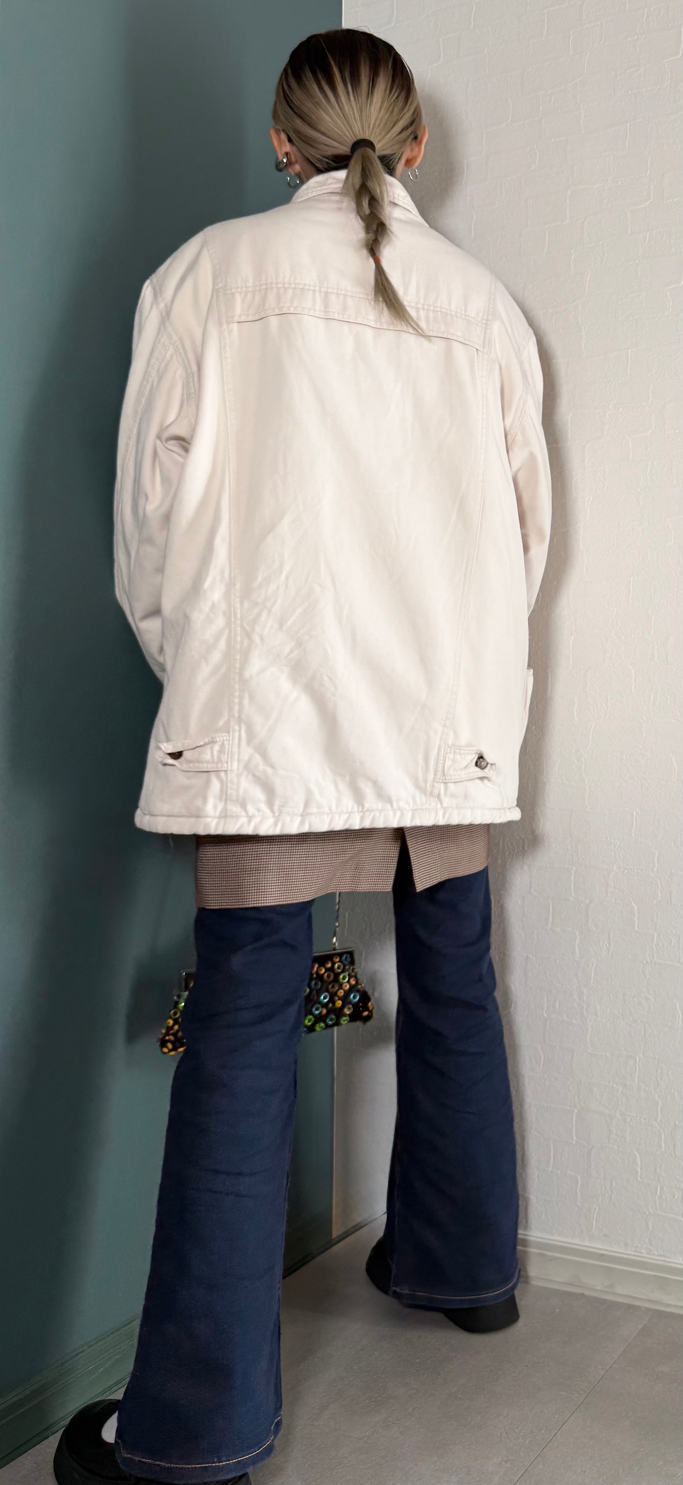 ペイズリー柄の裏地がさりげなく覗くデザインで、古着らしい遊び心と品の良さを感じる1着です。