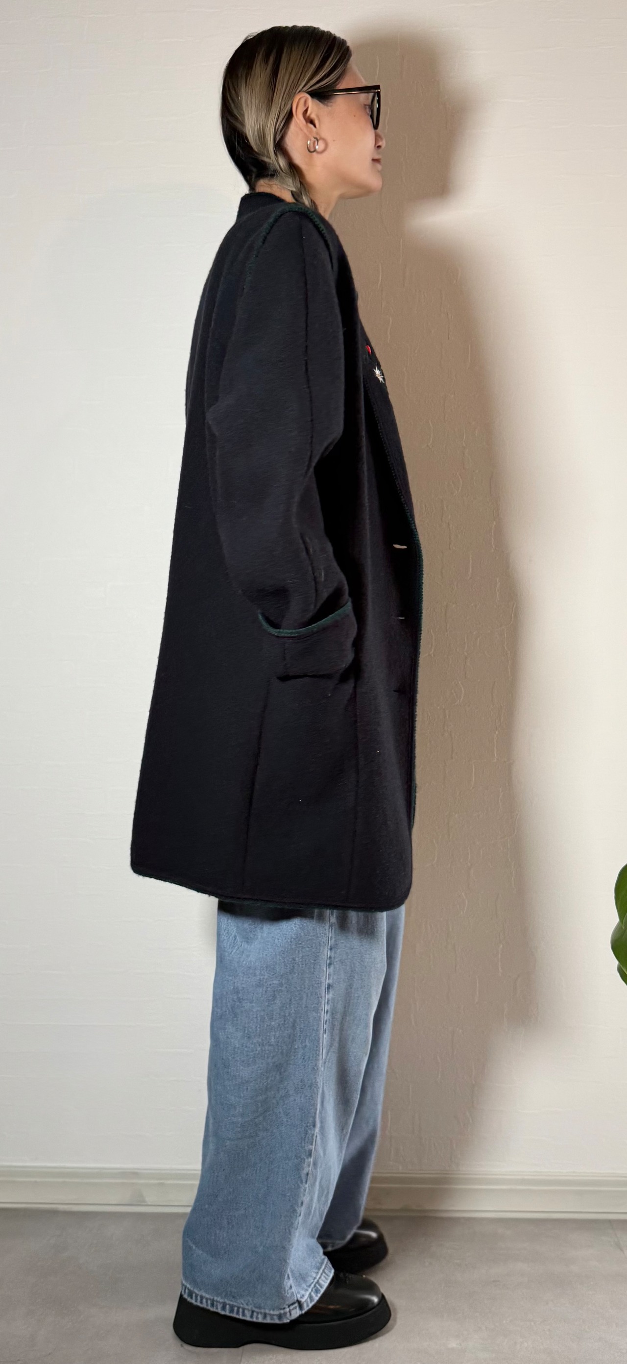 深みのあるネイビーに、グリーンのパイピングと小花刺繍が映える一着です。