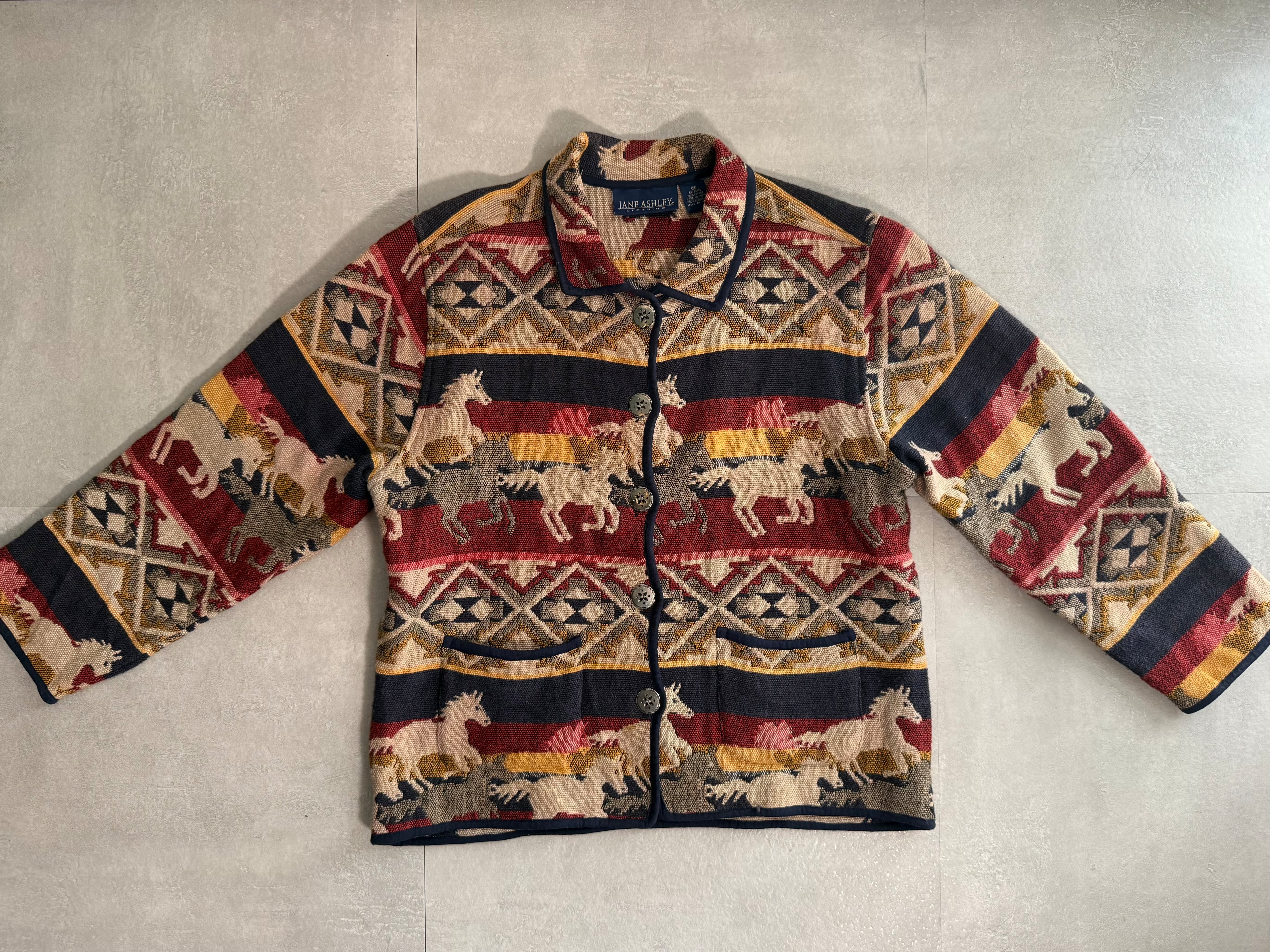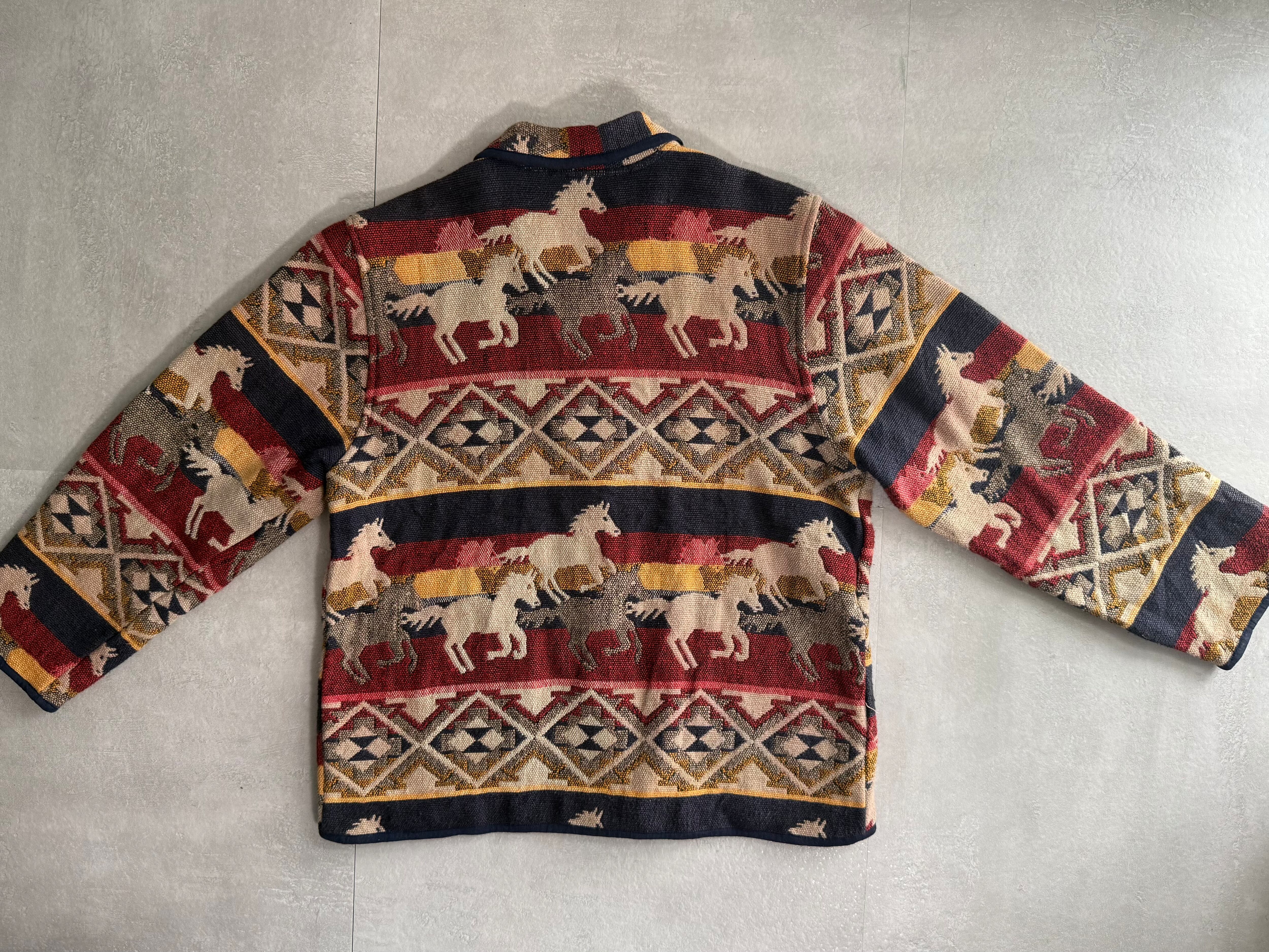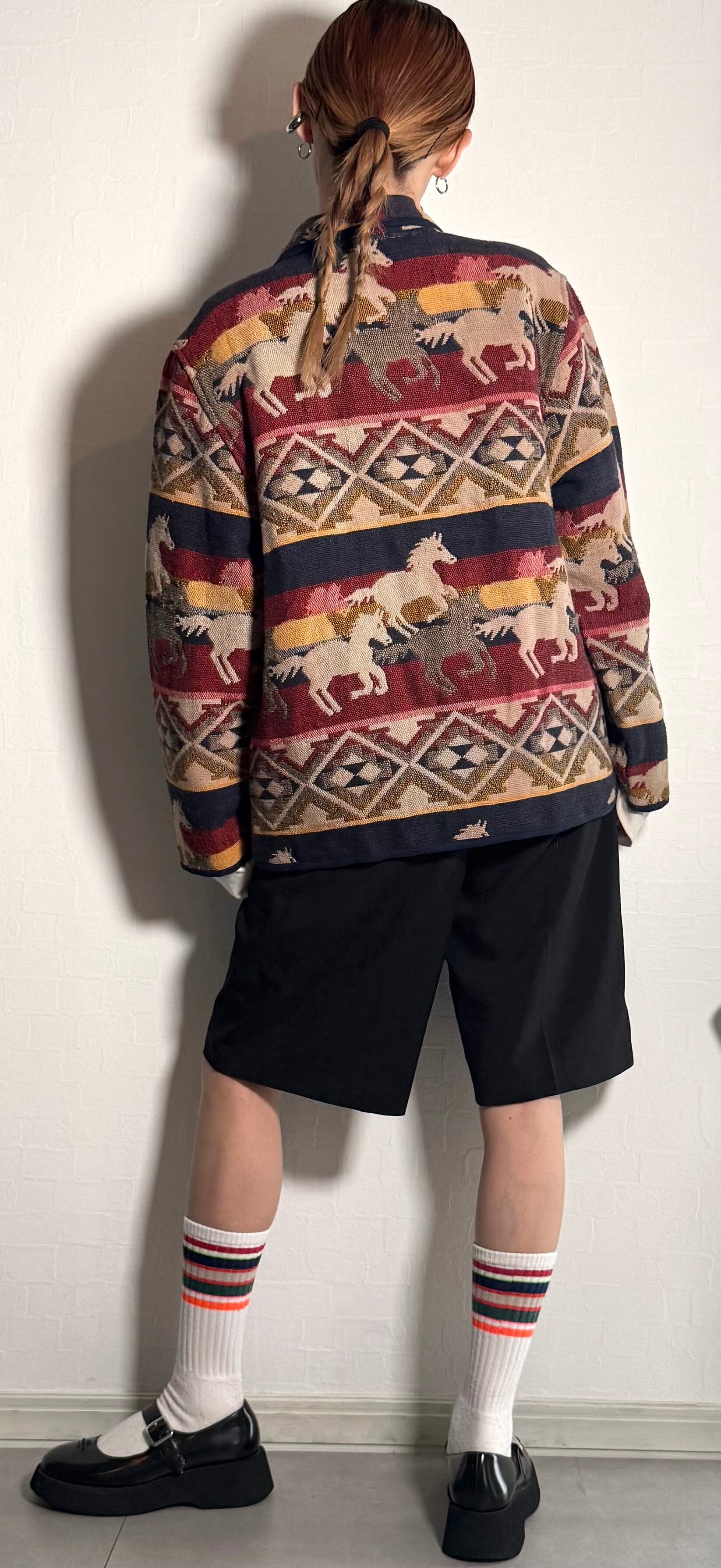 躍動感のある馬の群れとネイティブ柄が目を引く一着です。