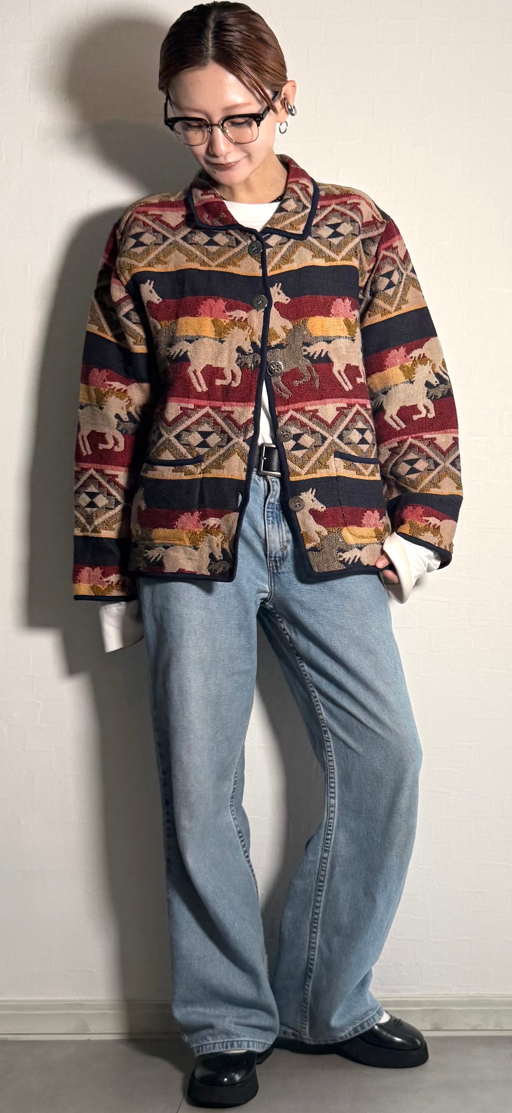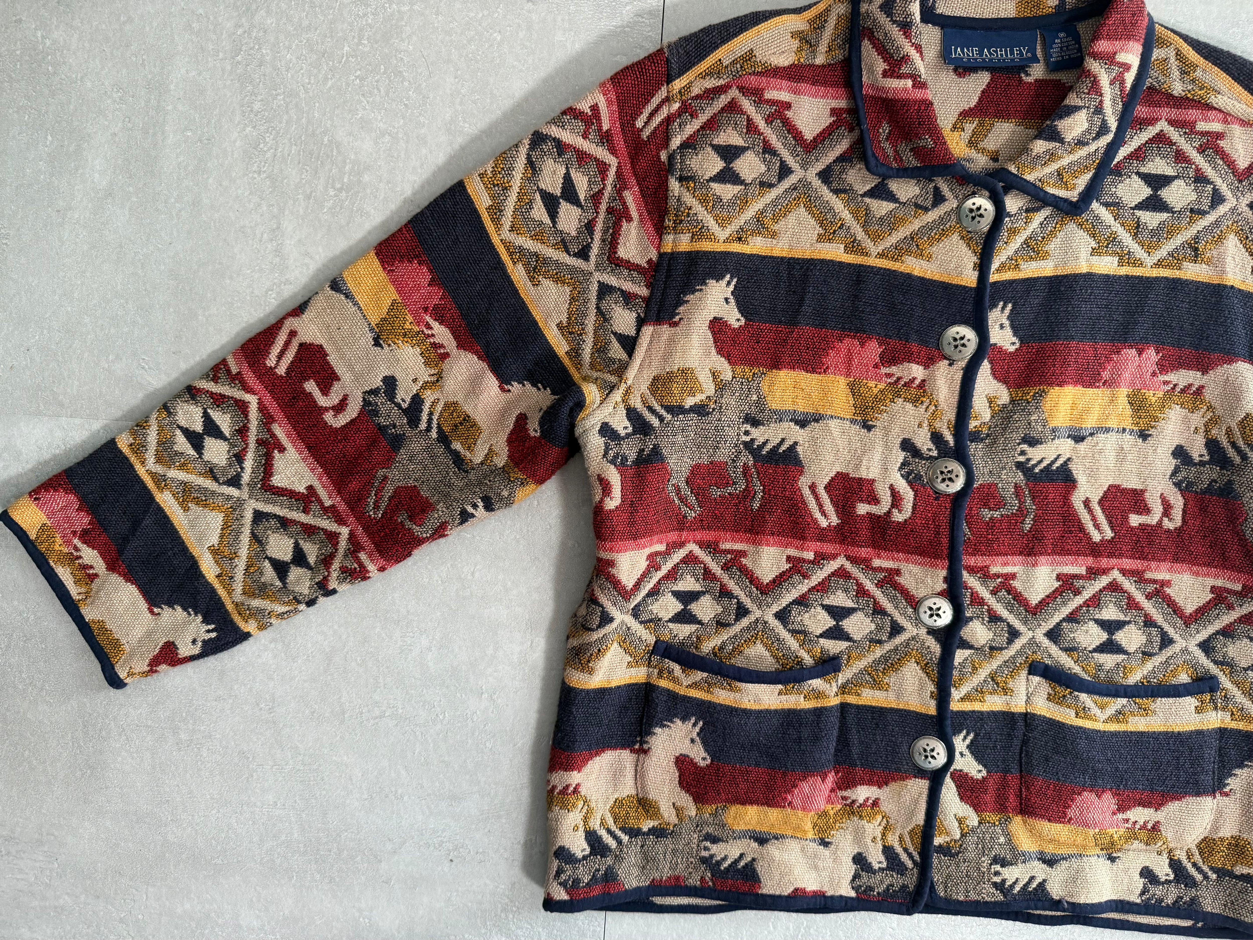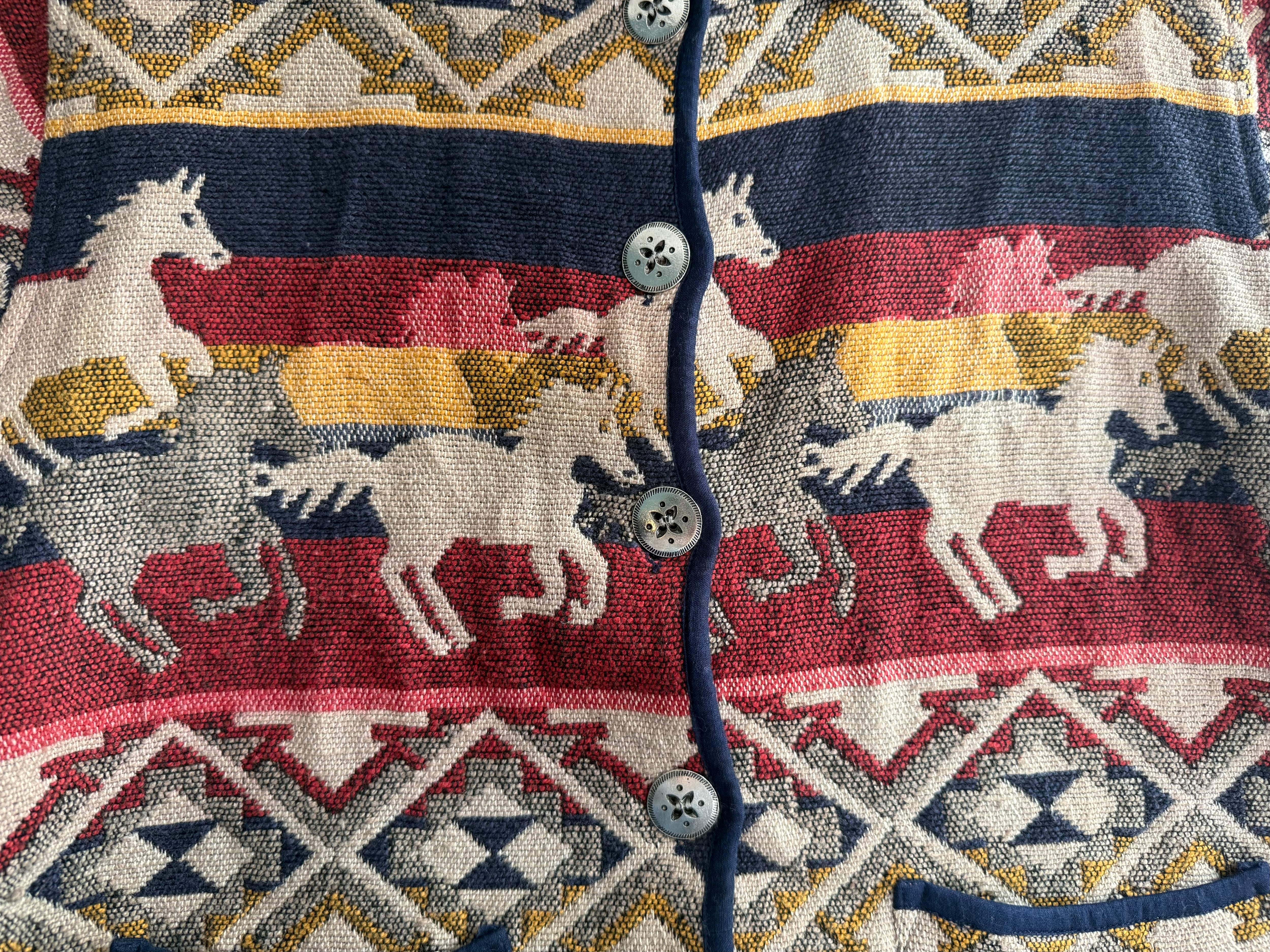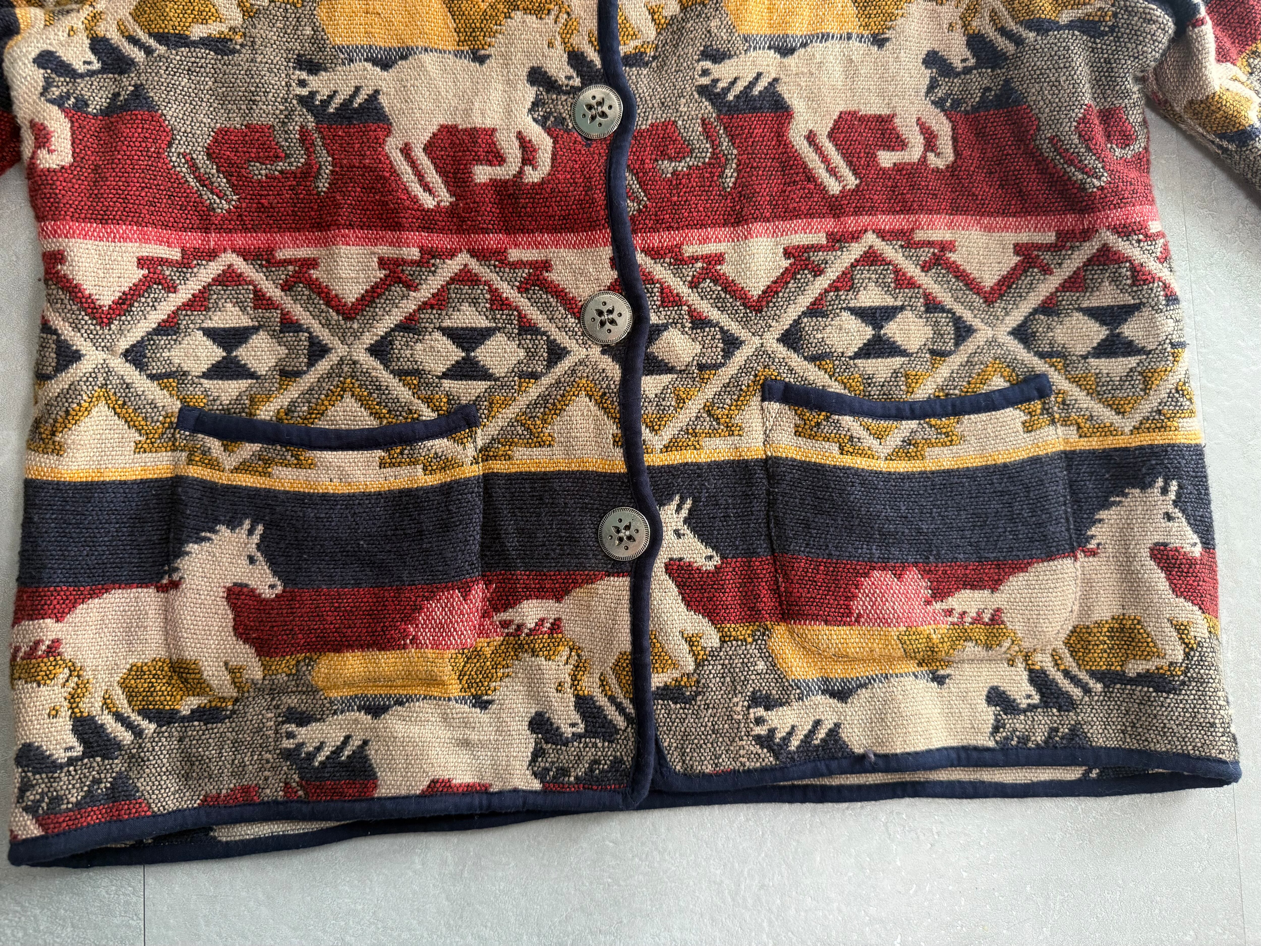 躍動感のある馬の群れとネイティブ柄が目を引く一着です。