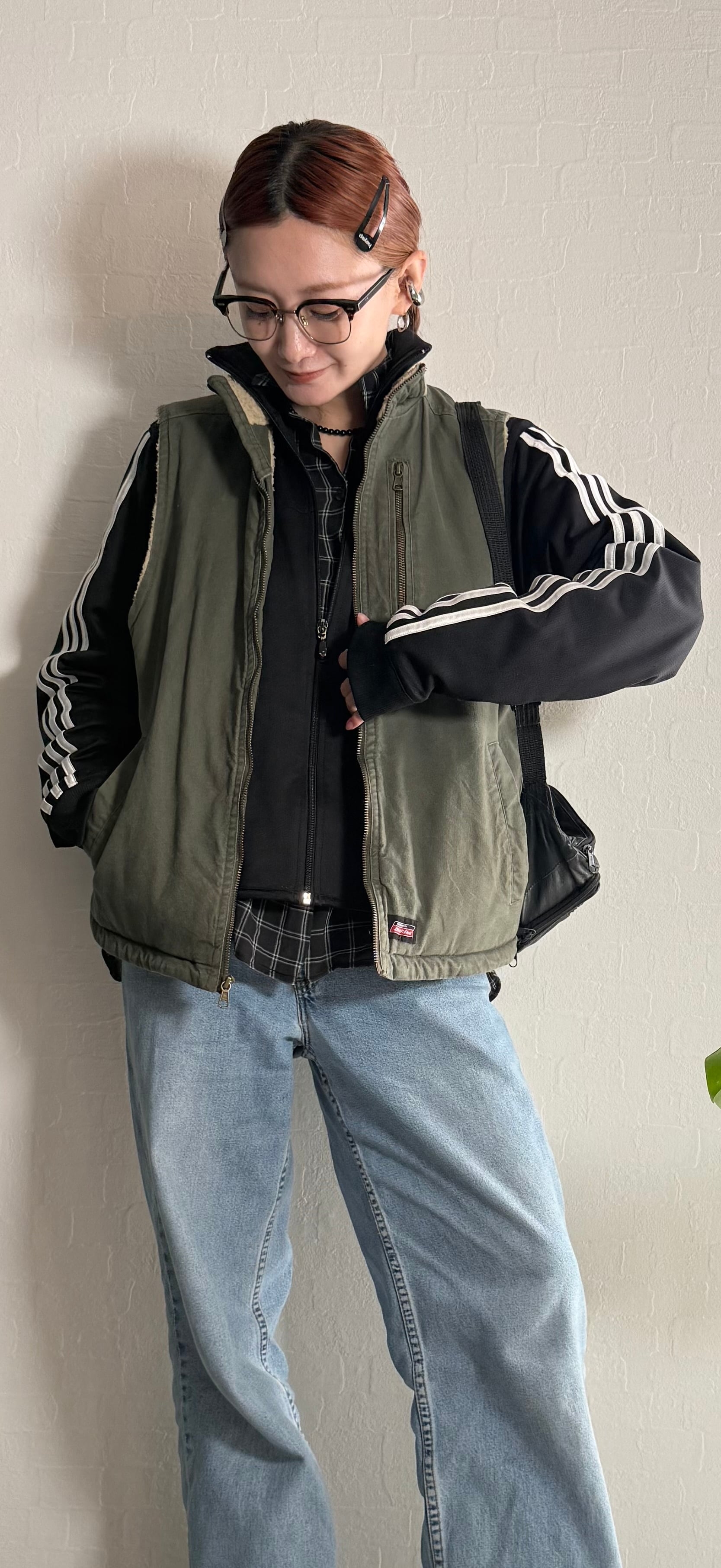 オリーブカラーはミリタリー感がありつつ、 ベージュボアとのコントラストで柔らかい印象に。